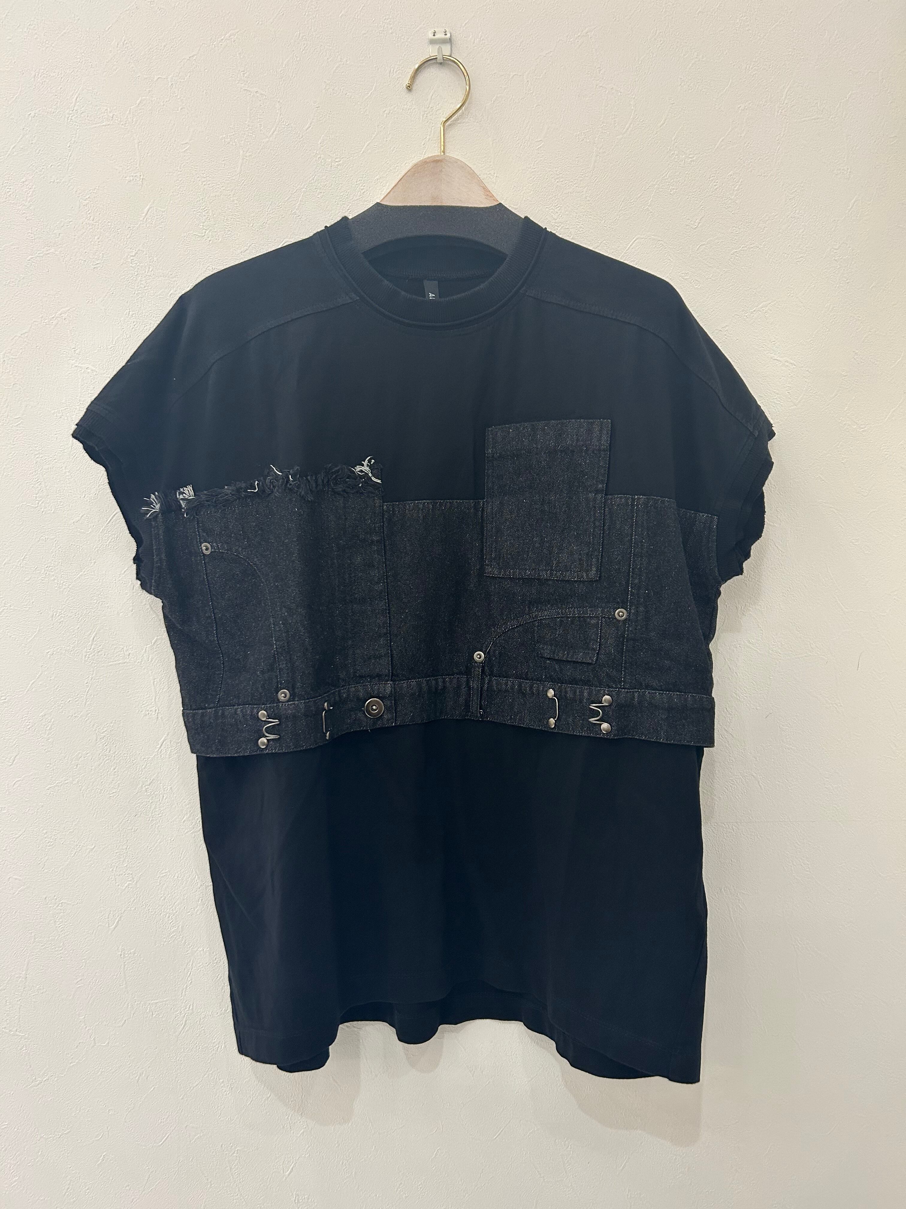 コットン天竺とライトオンスデニムのアシンメトリーコンビTシャツ。