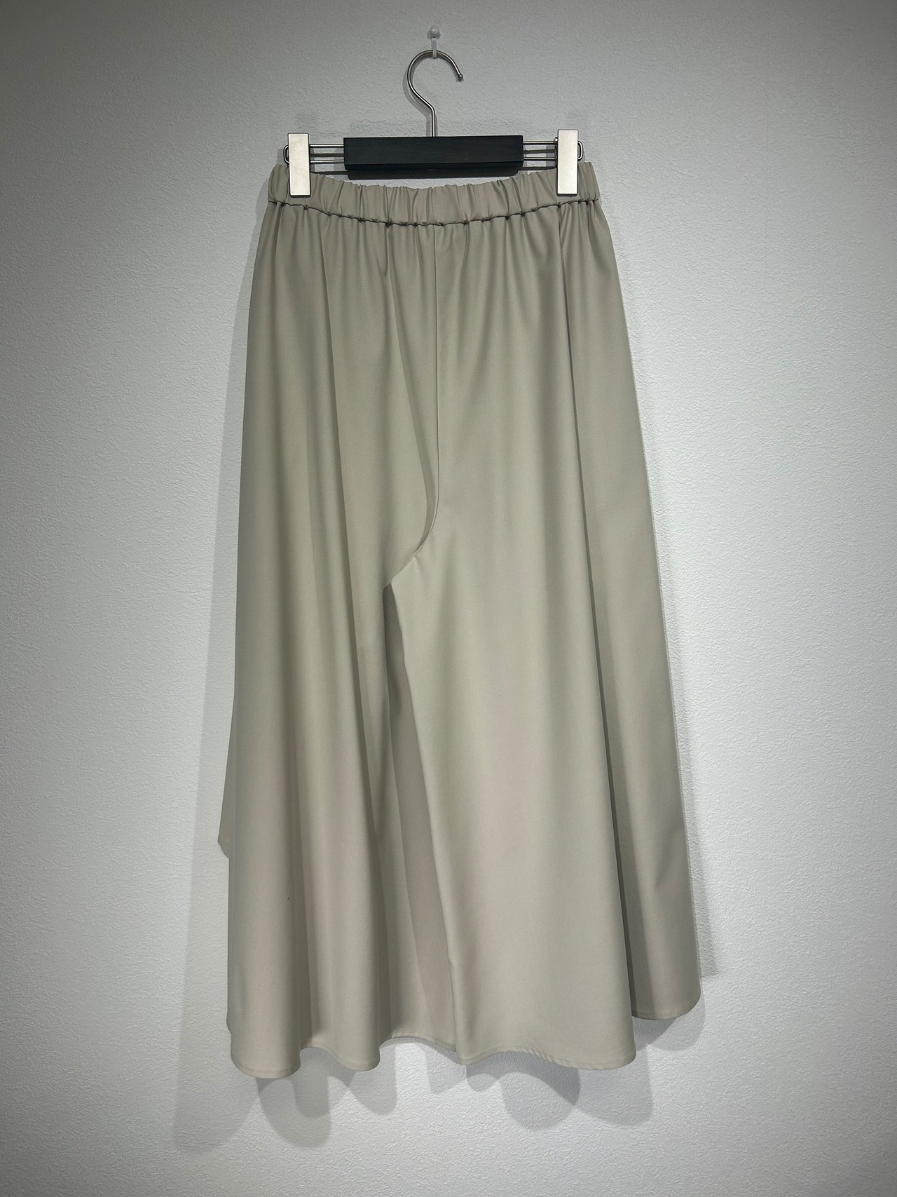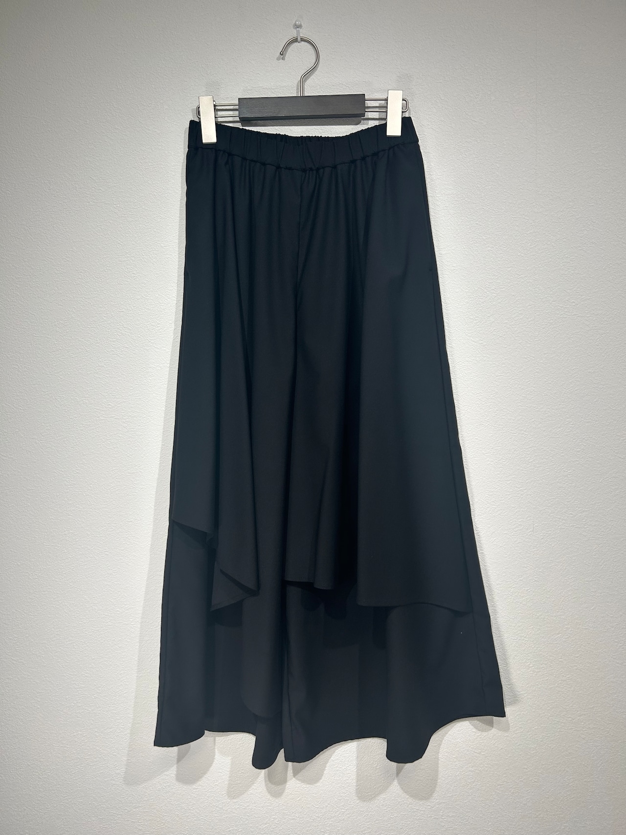 前のオーバー布は左右アシンメトリートのランダムフレアで、後はシンプルなフレアパンツデザインです。
